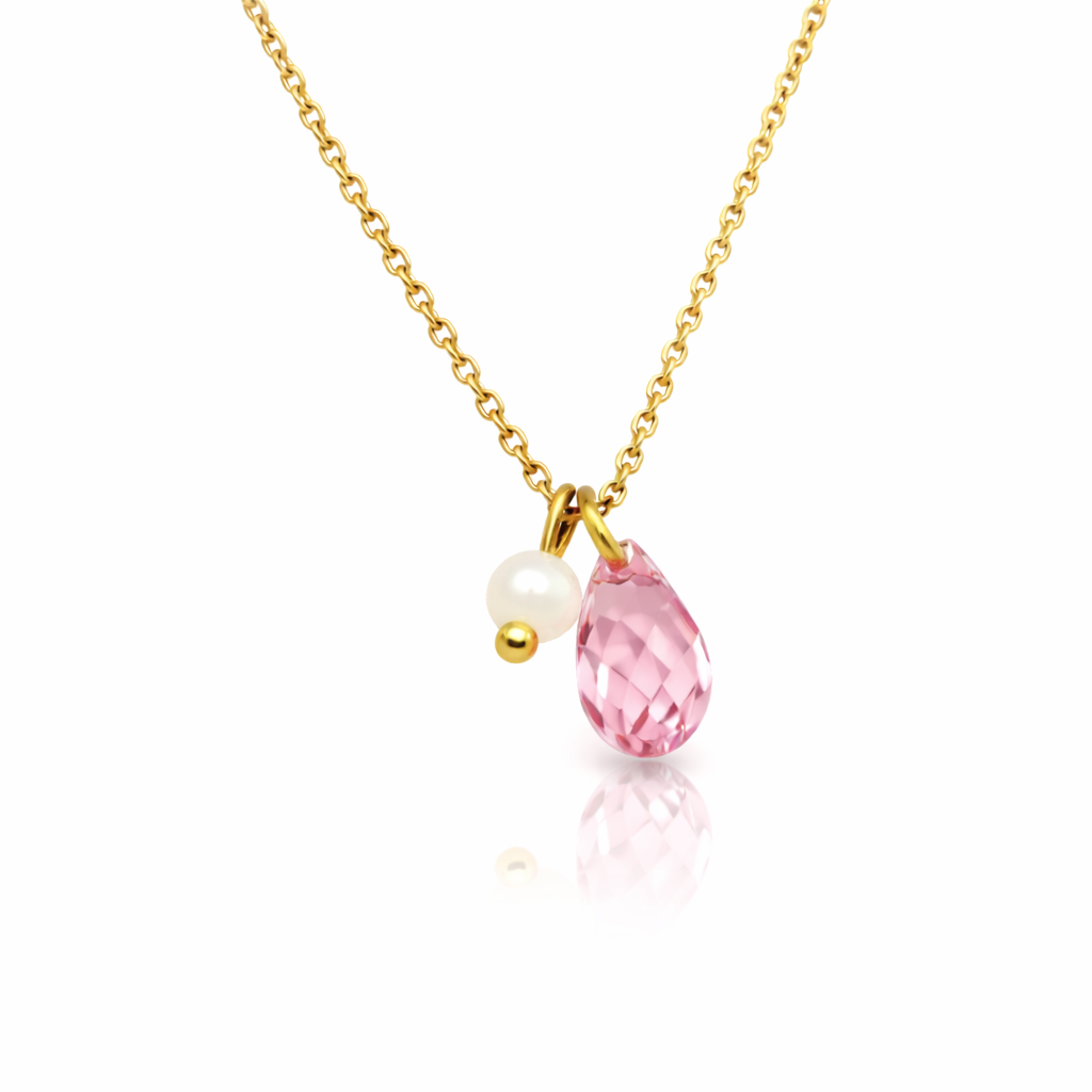 Ce collier est composé d'une chaîne maille forçat (1,25 mm), ornée d'un pendentif rond en nacre blanche et d'une goutte de cristal rose.