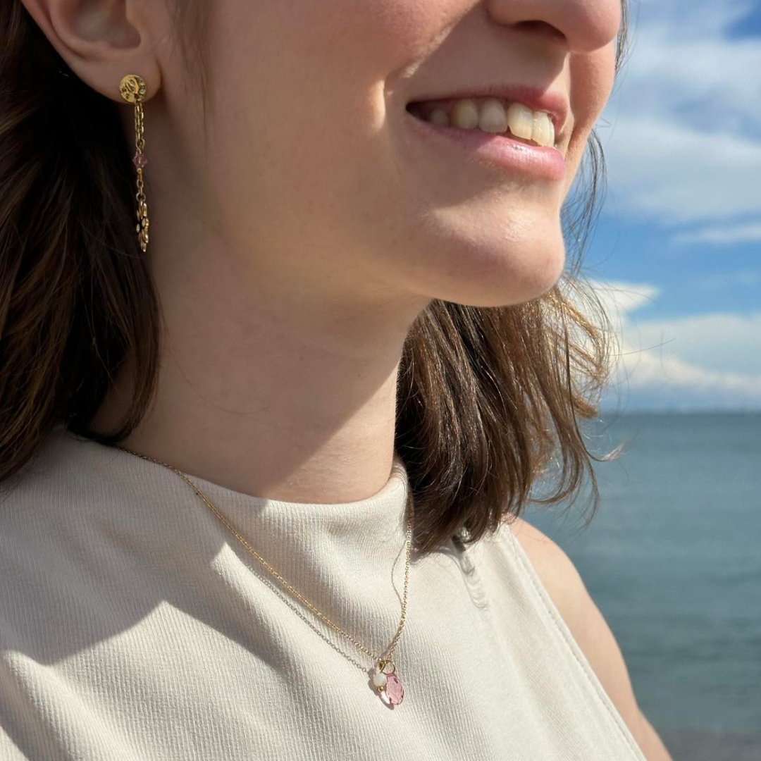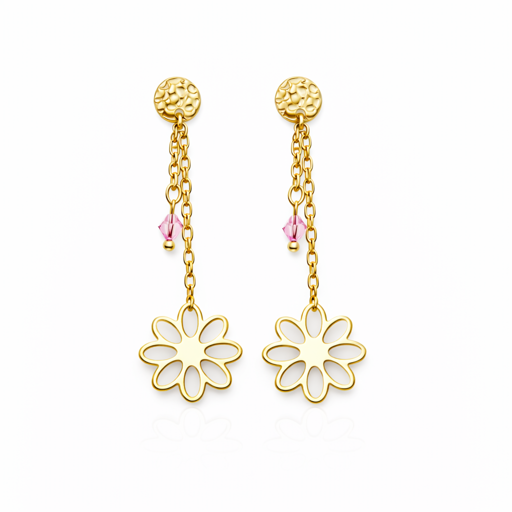 Ces boucles d'oreilles en acier inoxydable doré captivent par leur élégance, ornées d’une perle ronde en cristal rose et rehaussées par un pendentif en acier doré en forme délicate de marguerite.